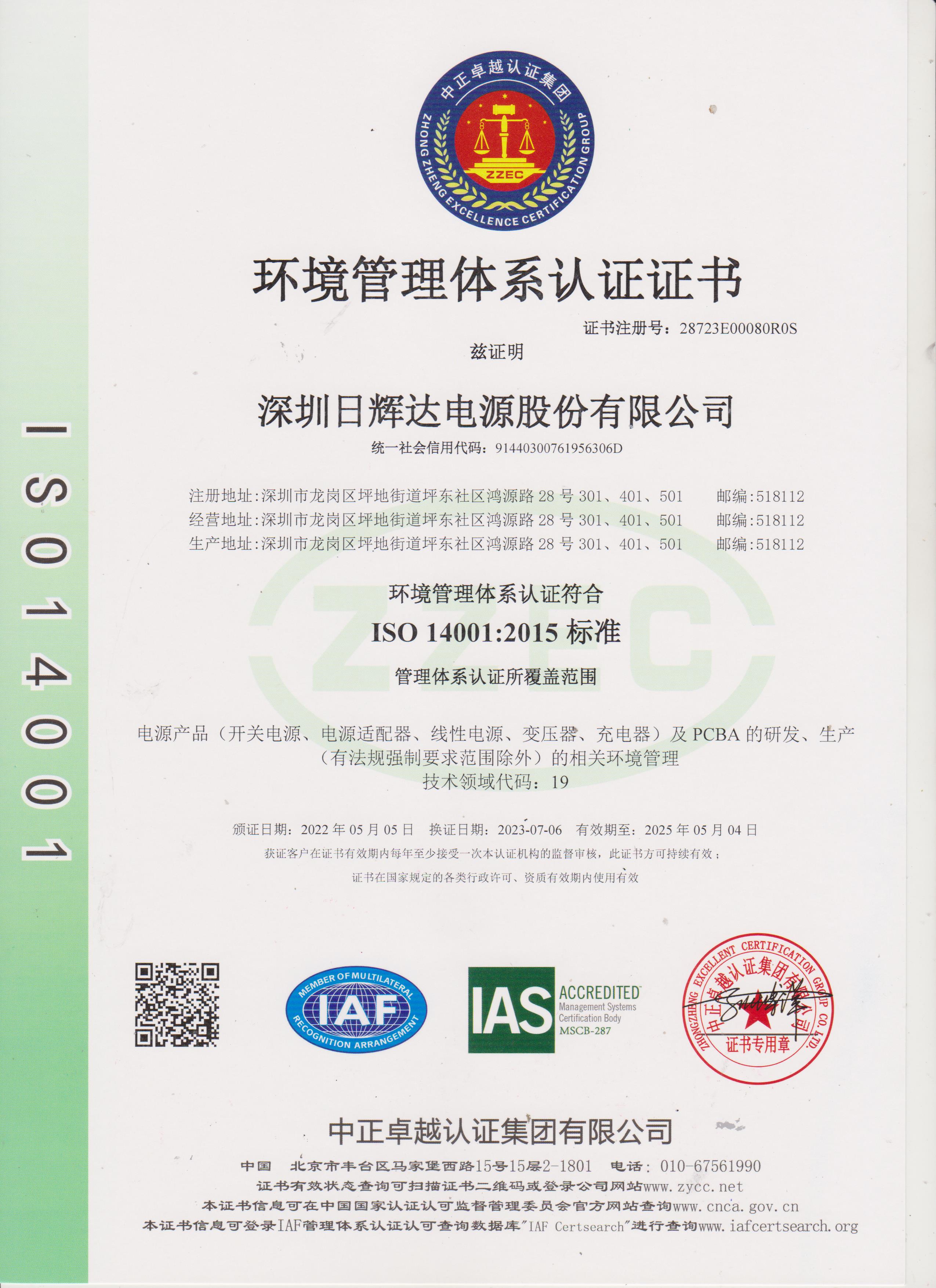 ISO 14001 Certificate (Chinese Version)